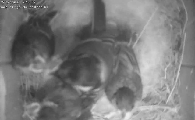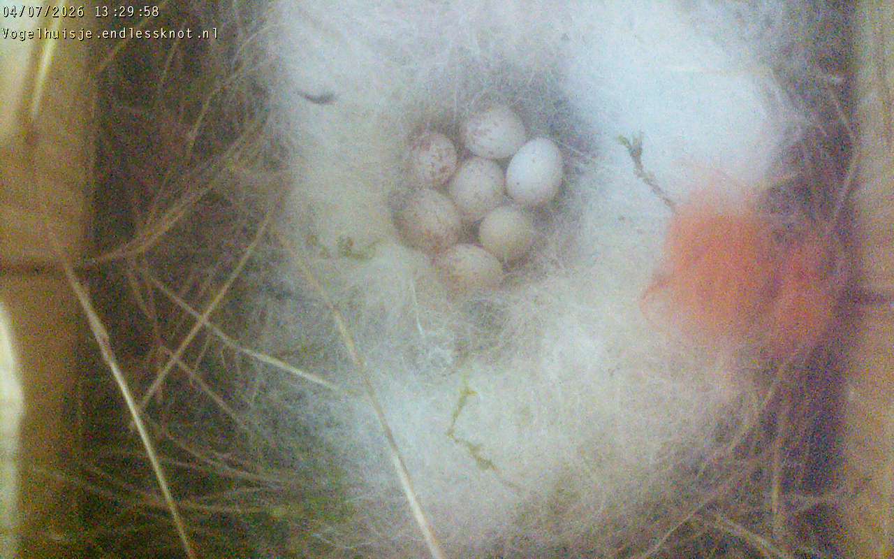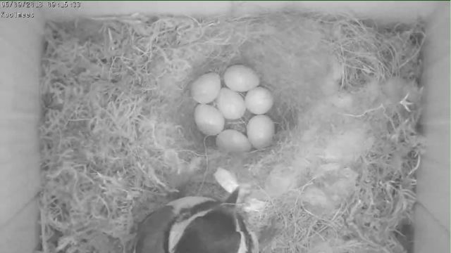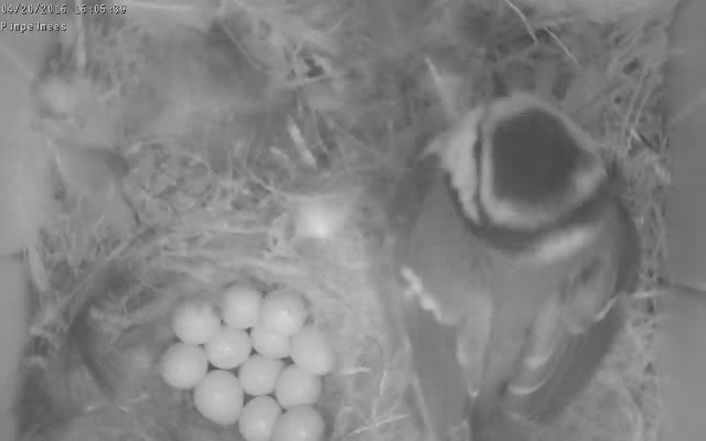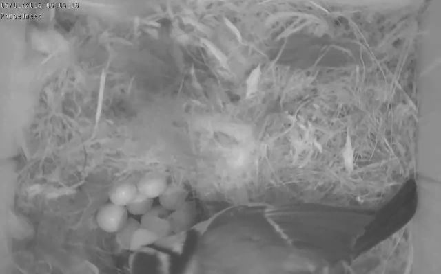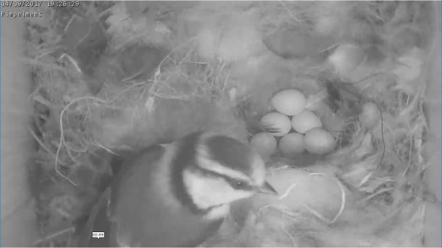 heeft de broedende pimpelmees haar nest verlaten. En helaas is er daarna niet meer op de eieren gebroed, In 2017 is geen van de eieren uitgekomen. |